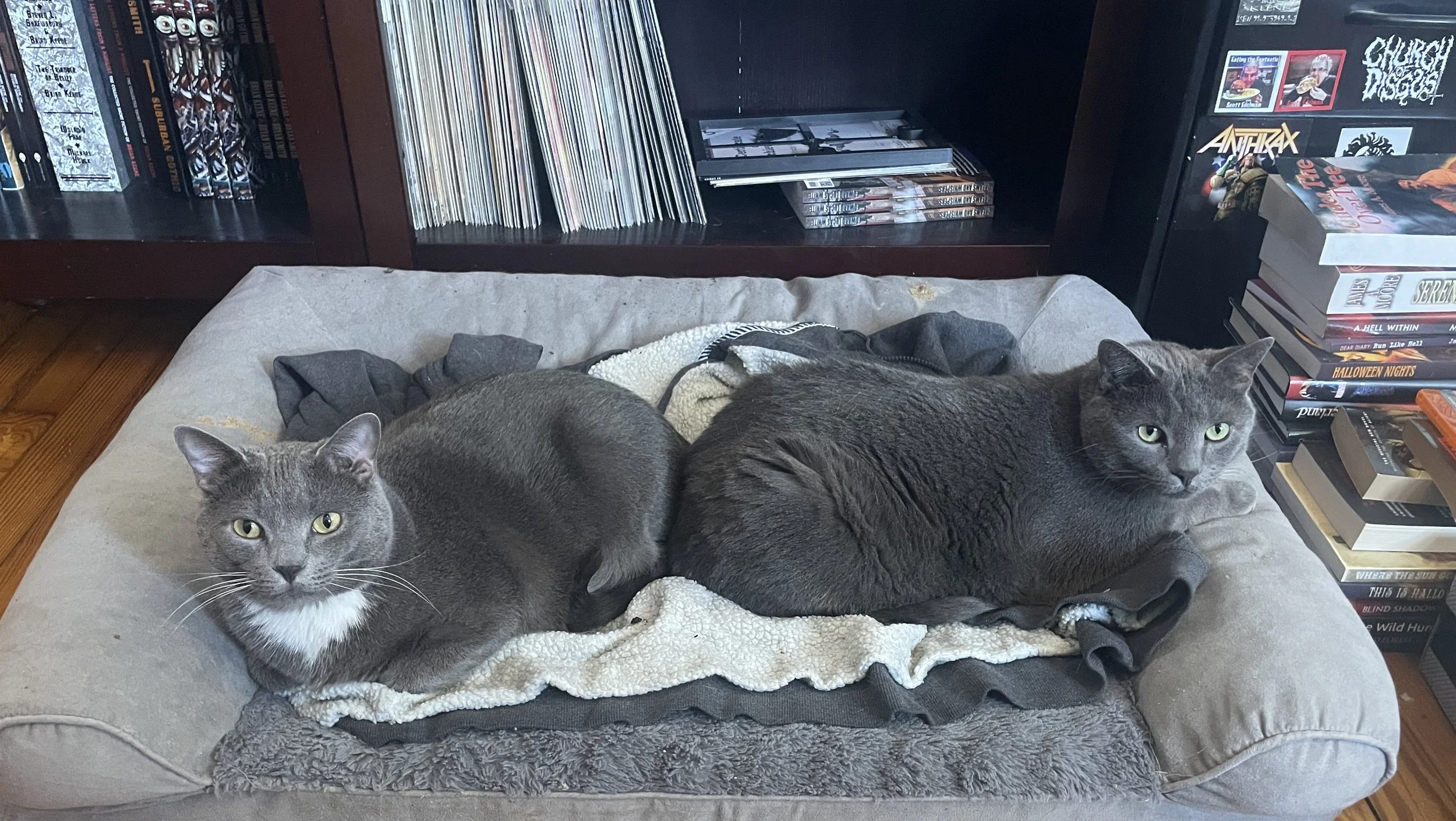 Ignore the mess. That big stack of books to Stripe’s right are for James A. Moore’s brother. I’ve gone this entire frigid winter unable to wear that fleece jacket the cats are laying on because they guard it like Smaug protecting his treasure.